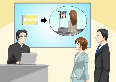 最近話題の「顔認証」技術が、オフィスや工場への入退室管理や防犯対策に使えることがわかったアミダ社の中村和人。「うちのような中小企業でも導入できるだろうか」。情報収集のため、加藤彩を伴って、最新の認証技術が紹介される展示会に参加してみることにした。