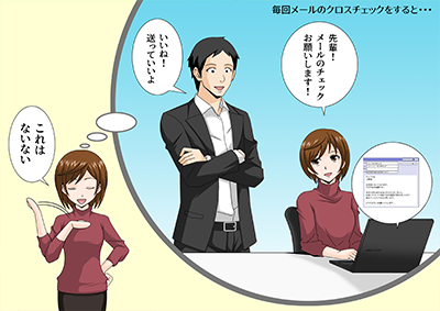 「でも、メール誤送信って個人が気をつければいいことじゃないですか。私だって、いつも送信ボタンをクリックする前に宛先に間違いがないか、チェックしていますよ。メールは書いたらすぐに送らず、一呼吸おいて再度内容や宛先を確認してから送るというのは、社会人の常識!」と、加藤は自慢げに言う。