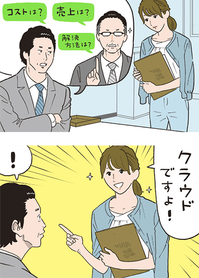「おっと、ごめんごめん、脱線したね。クラウドの話に戻そう。確かに、苦しい事情は担当役員としても理解しているつもりだ。ただ、今期の新製品拡販のために営業も手が足りないっていうんだよ。でも、万一、誰かが異動することになっても、残りのメンバーの残業時間が増えたりするのは避けたい。“働き方改革”はうちのような企業でも取り組まなくちゃいけない重要課題だからね。だから、人手が少なくても効率的にシステムを開発したり、運用するためにこそ、クラウドに切り替えるべきじゃないかと考えているんだ」