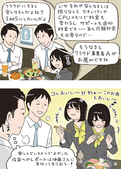 そうなのだ。中村との電話を聞いていた伊藤が、飲み会なら私も行きますよ、と言ってきたので、一応場所と時間を伝えていたのだ。とりあえずビールで乾杯して、伊藤のことを紹介した後に、上野はライゾウ社のクラウド化案件について早速話を切り出した。