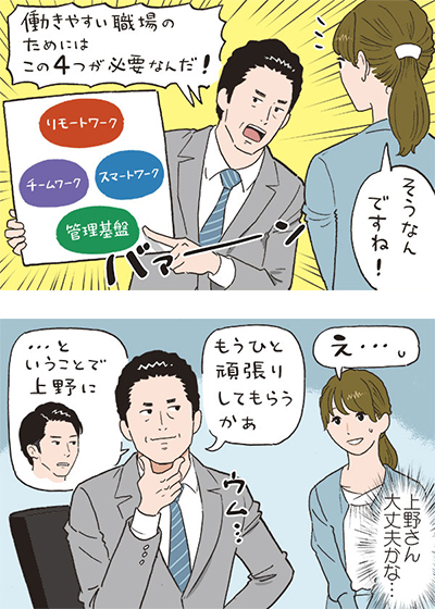 働き方改革の理念を一気にまくし立てる高橋に、本田は少し圧倒されていた。(こんなふうに熱く語る役員は久しぶりに見たわ)。